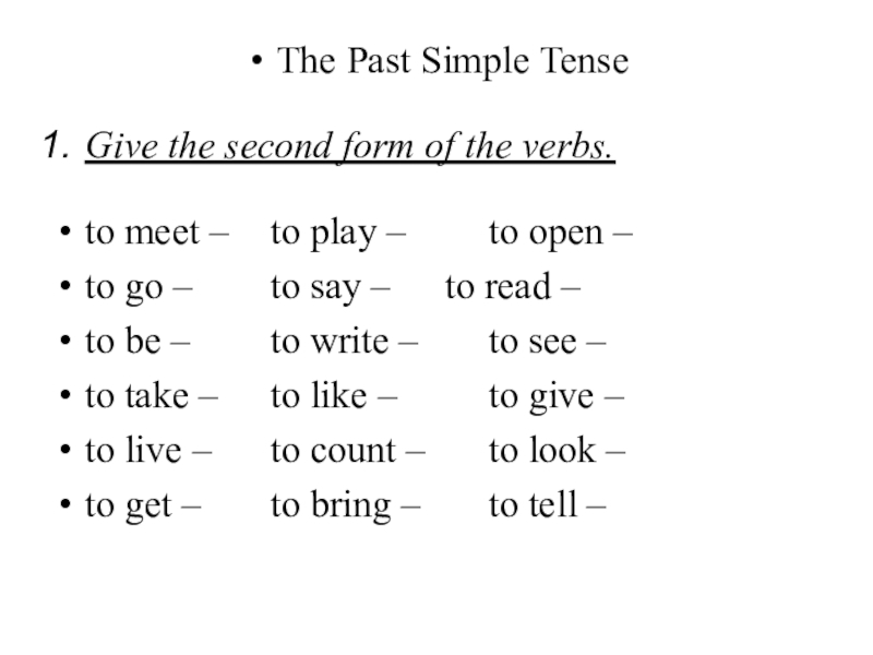 The Past Simple TenseGive the second form of the verbs.to meet – 	to play –		to open –