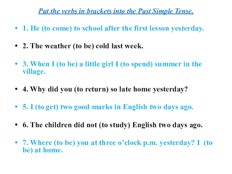 Слайд 8Put the verbs in brackets into the Past Simple Tense.