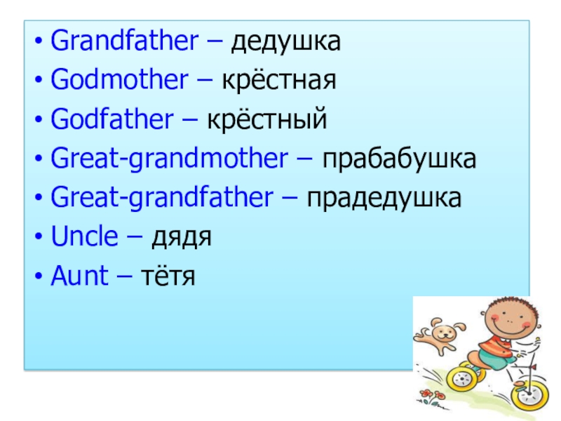 Grandfather – дедушкаGodmother – крёстнаяGodfather – крёстныйGreat-grandmother – прабабушкаGreat-grandfather – прадедушкаUncle – дядяAunt – тётя