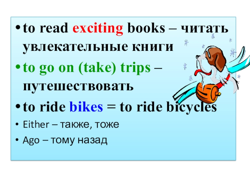 to read exciting books – читать увлекательные книгиto go on (take) trips – путешествоватьto ride bikes =