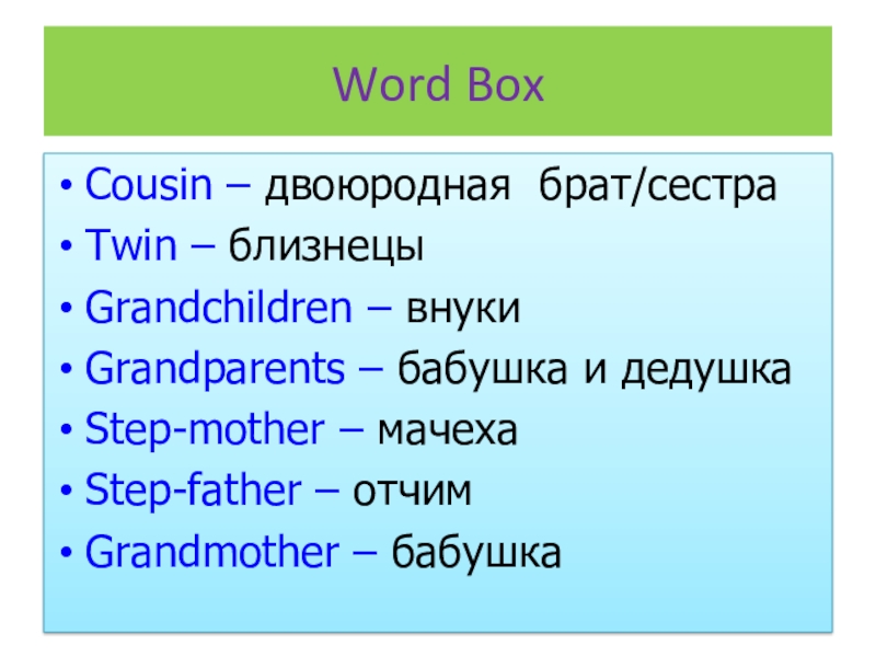 Word BoxCousin – двоюродная брат/сестраTwin – близнецыGrandchildren – внукиGrandparents – бабушка и дедушкаStep-mother – мачехаStep-father – отчимGrandmother – бабушка