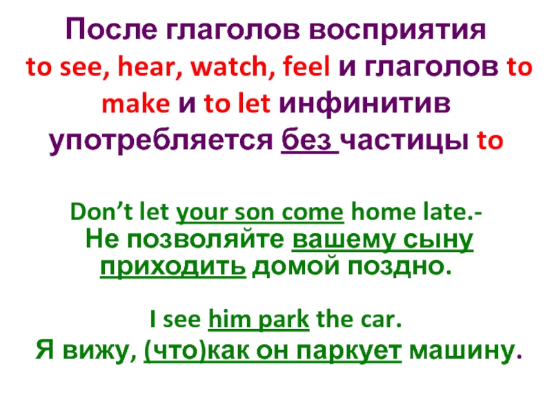 После глаголов восприятия to see, hear, watch, feel и глаголов to make и to let инфинитив употребляется