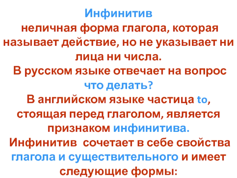 Инфинитив неличная форма глагола, которая называет действие, но не указывает ни лица ни числа. В русском языке отвечает на вопрос что делать? В английском языке частица to, стоящая перед глаголом, является признаком инфинитива. Инфинитив сочетает в