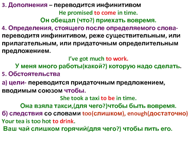 3. Дополнения – переводится инфинитивом He promised to come in time. Он обещал (что?) приехать вовремя.4. Определения,