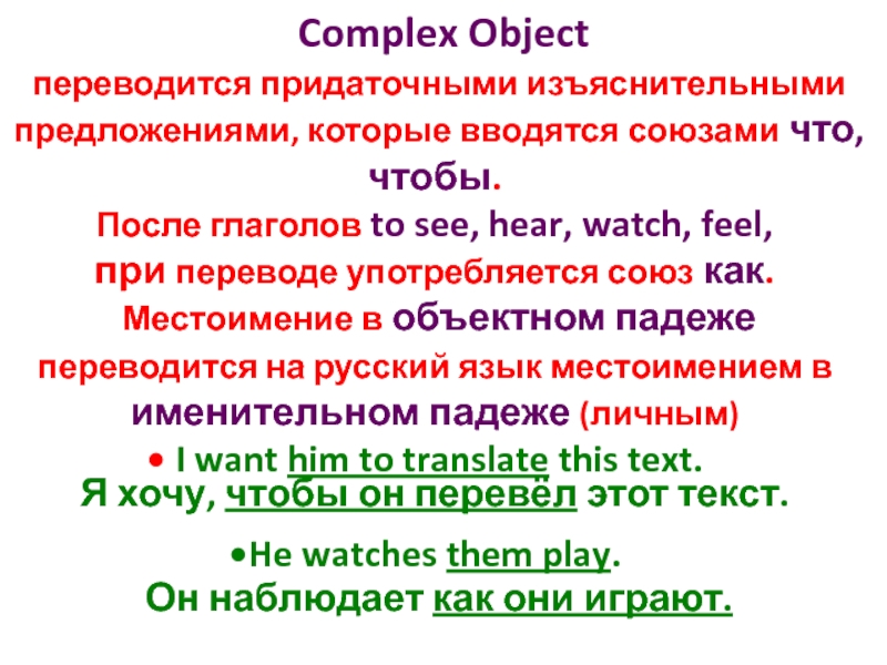 Complex Object переводится придаточными изъяснительными предложениями, которые вводятся союзами что, чтобы.После глаголов to see, hear, watch,