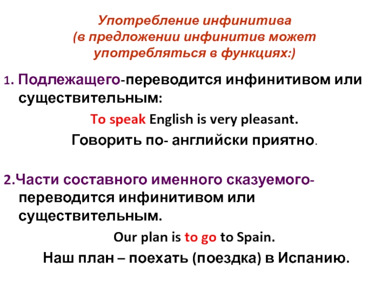Употребление инфинитива (в предложении инфинитив может употребляться в функциях:)1. Подлежащего-переводится инфинитивом или существительным: To speak English is