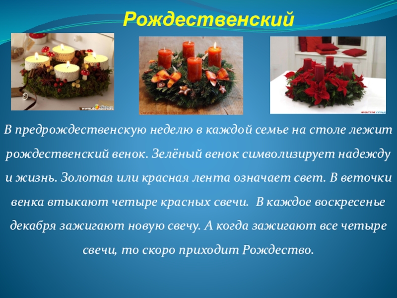 Слайд 22В предрождественскую неделю в каждой семье на столе лежит рождественский венок.
