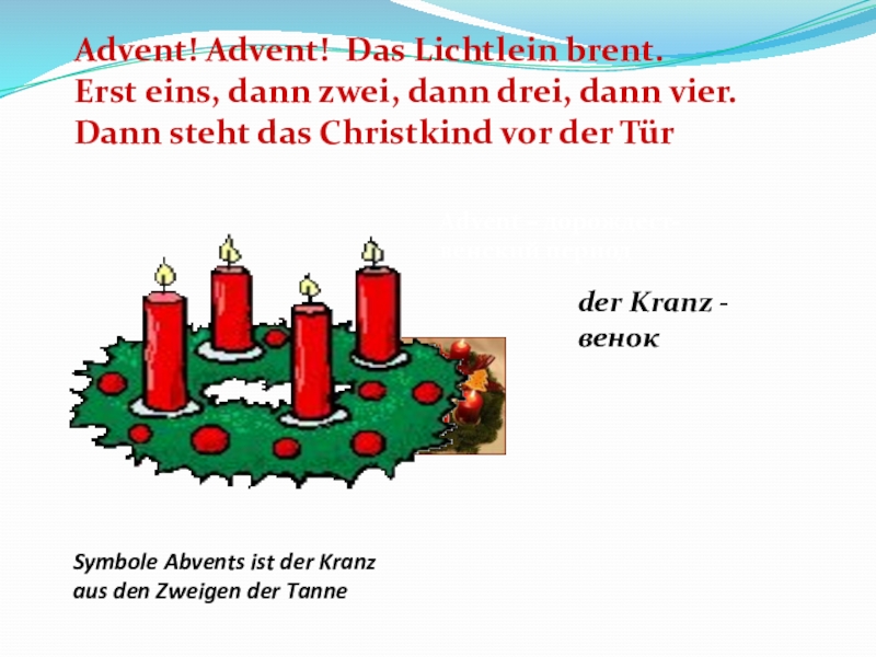 Зелёный венок символизирует надежду и жизнь. Золотая или красная лента означает свет. В веточки венка втыкают четыре красных свечи. В каждое воскресенье декабря зажигают новую свечу. А когда зажигают все четыре свечи, то скоро приходит Рождество.