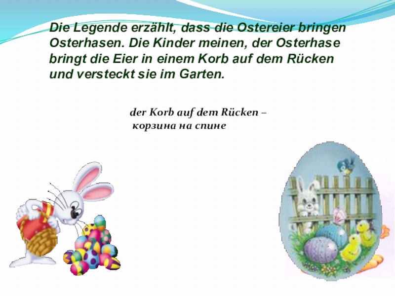Слайд 7Die Legende erzählt, dass die Ostereier bringen Osterhasen. Die Kinder meinen,