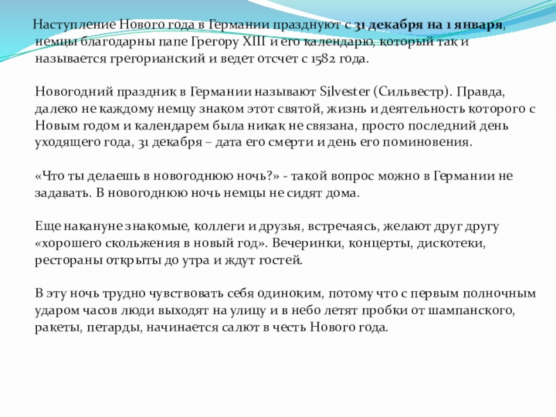 на 1 января, немцы благодарны папе Грегору XIII и его календарю, который так и называется грегорианский и ведет отсчет с 1582 года.