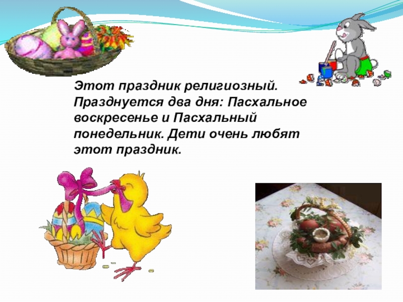 Слайд 4Этот праздник религиозный. Празднуется два дня: Пасхальное воскресенье и Пасхальный понедельник.