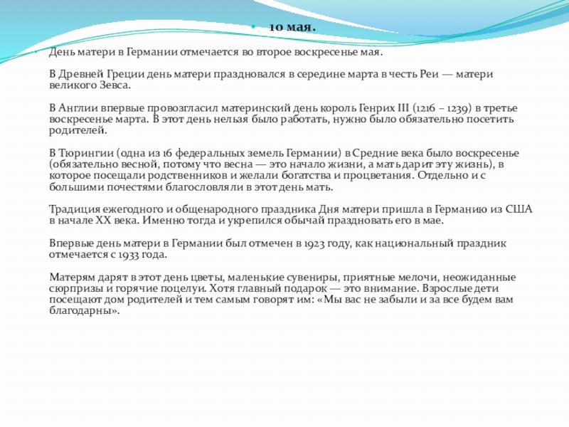 Традиция ежегодного и общенародного праздника Дня матери пришла в Германию из США в начале XX века. Именно тогда и укрепился обычай праздновать его в мае.