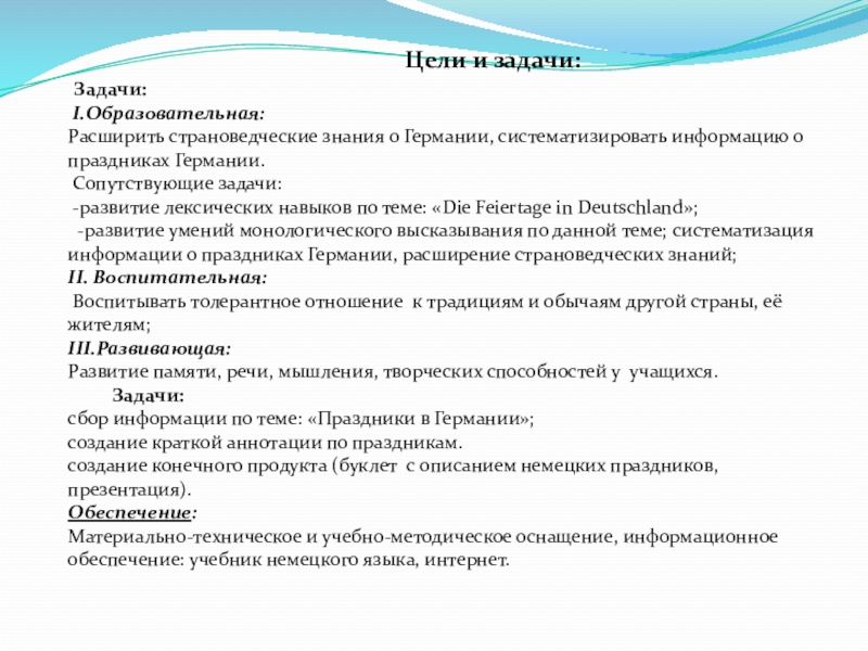 -развитие умений монологического высказывания по данной теме; систематизация информации о праздниках Германии, расширение страноведческих знаний;