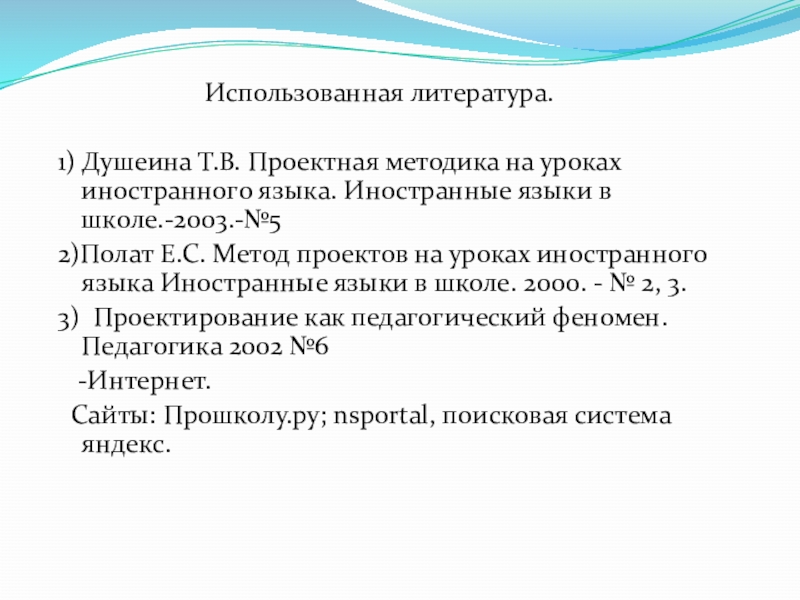 1) Душеина Т.В. Проектная методика на уроках иностранного языка. Иностранные языки в школе.-2003.-№5