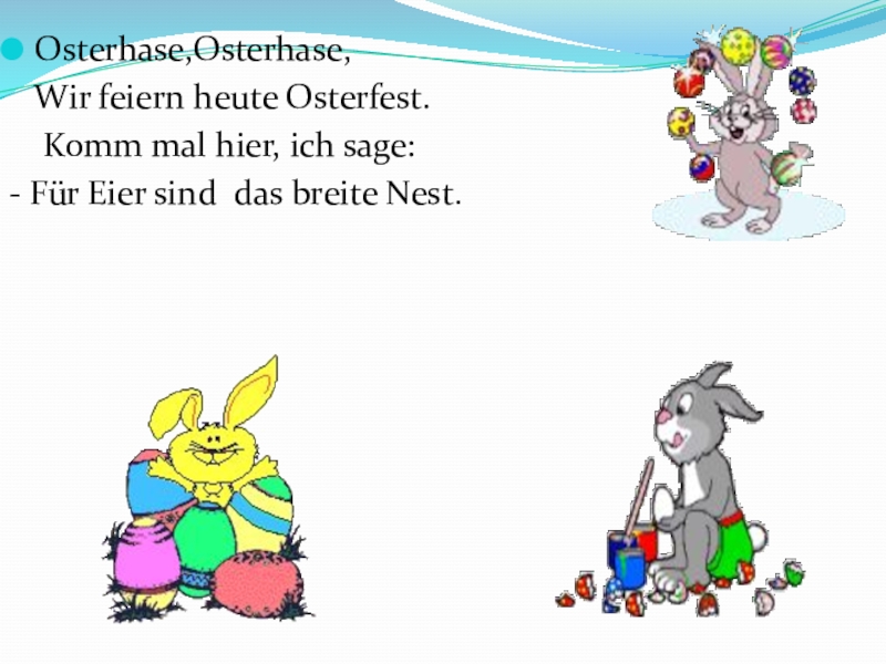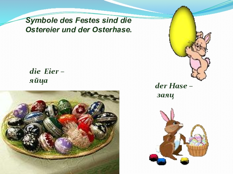 Слайд 6Symbole des Festes sind die Ostereier und der Osterhase.