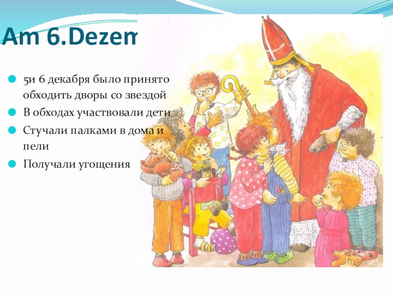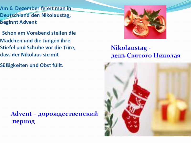 Слайд 18Am 6. Dezember feiert man in Deutschland den Nikolaustag, beginnt Advent