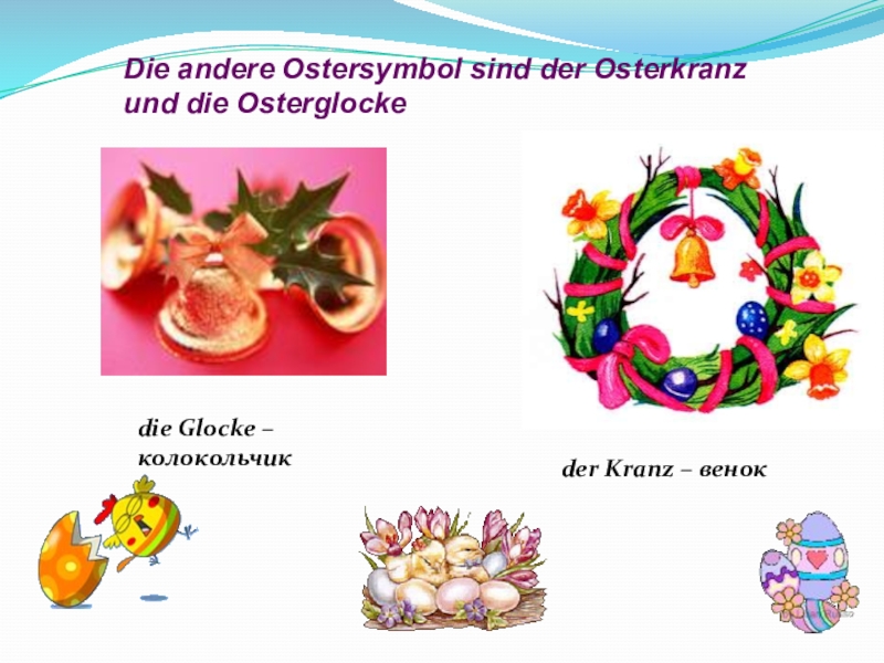 Слайд 9Die andere Ostersymbol sind der Osterkranz und die Osterglocke