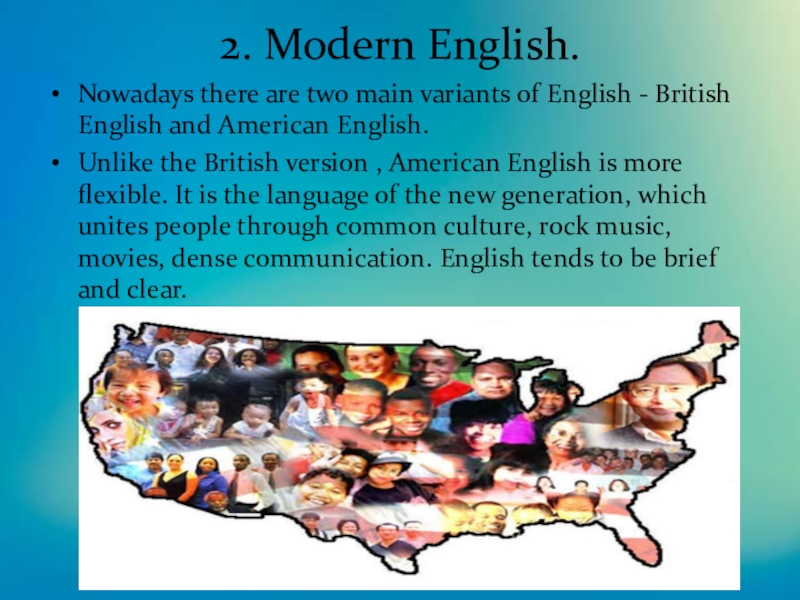 Unlike the British version , American English is more flexible. It is the language of the new generation, which unites people through common culture, rock music, movies, dense communication. English tends to be brief and clear.