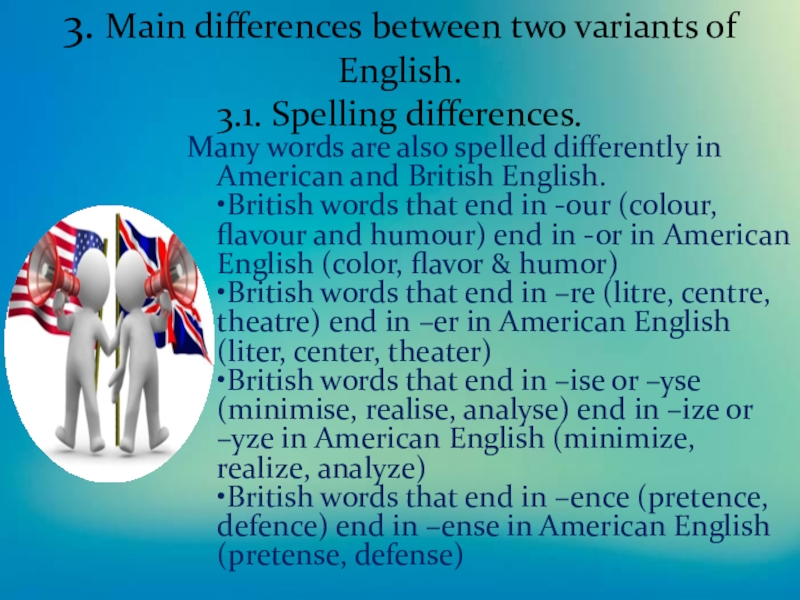 • British words that end in –ence (pretence, defence) end in –ense in American English (pretense, defense)