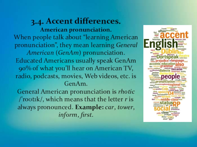 Educated Americans usually speak GenAm 90% of what you’ll hear on American TV, radio, podcasts, movies, Web videos, etc. is GenAm.