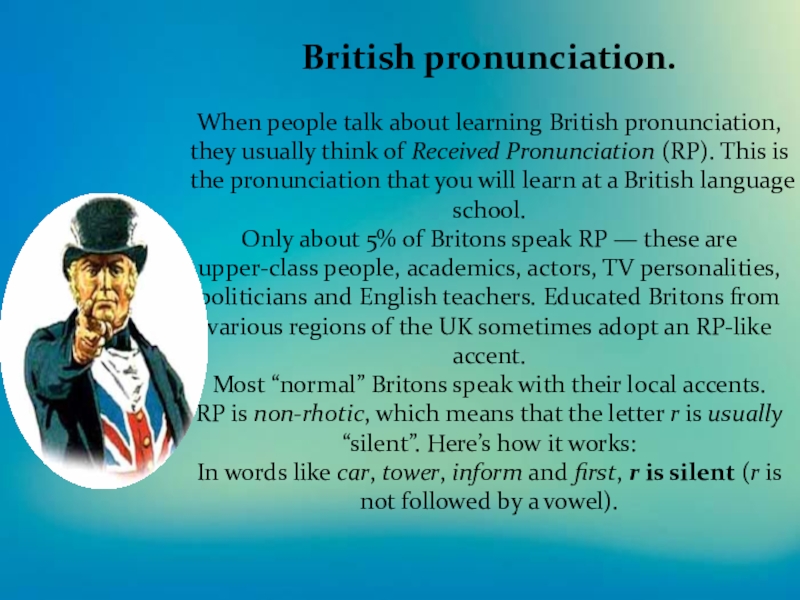 of Received Pronunciation (RP). This is the pronunciation that you will learn at a British language school.