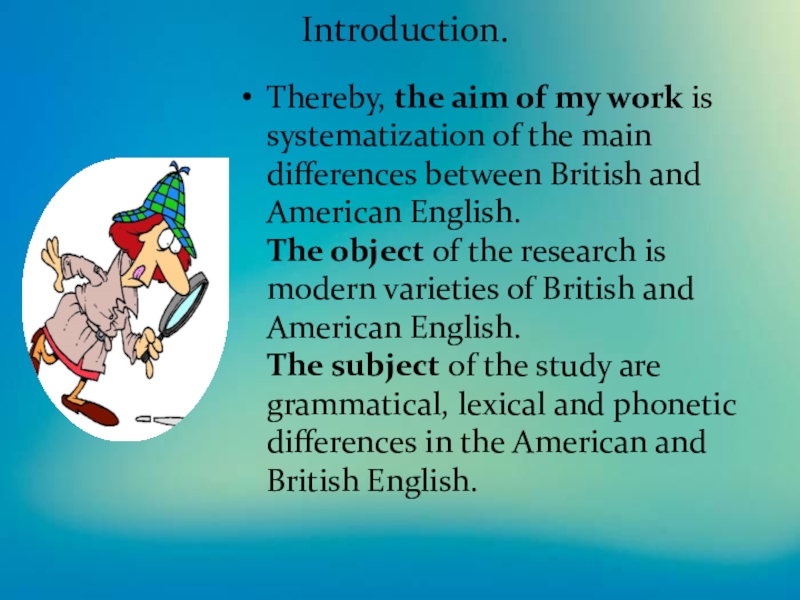 The subject of the study are grammatical, lexical and phonetic differences in the American and British English.