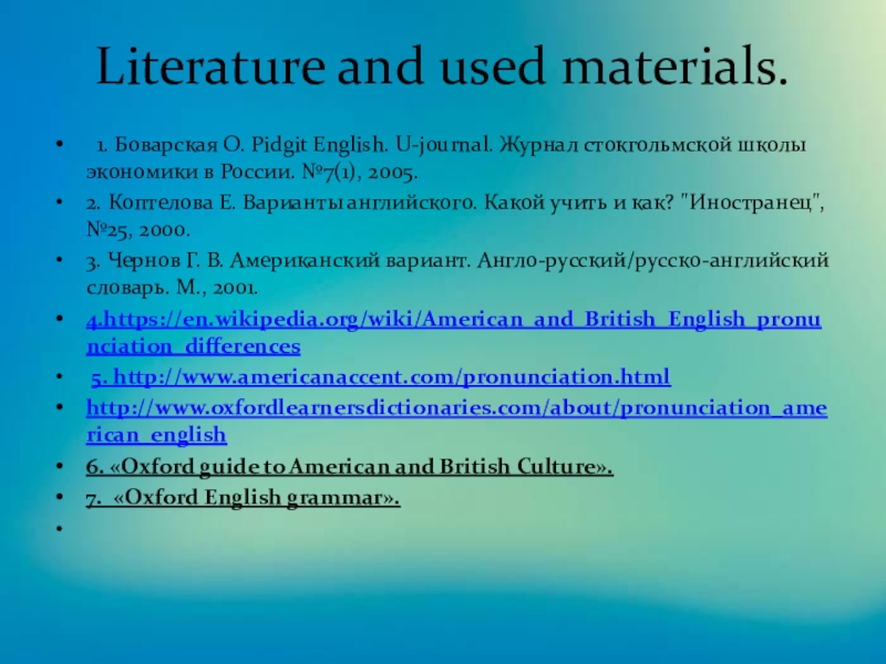 2. Коптелова Е. Варианты английского. Какой учить и как? "Иностранец", №25, 2000.