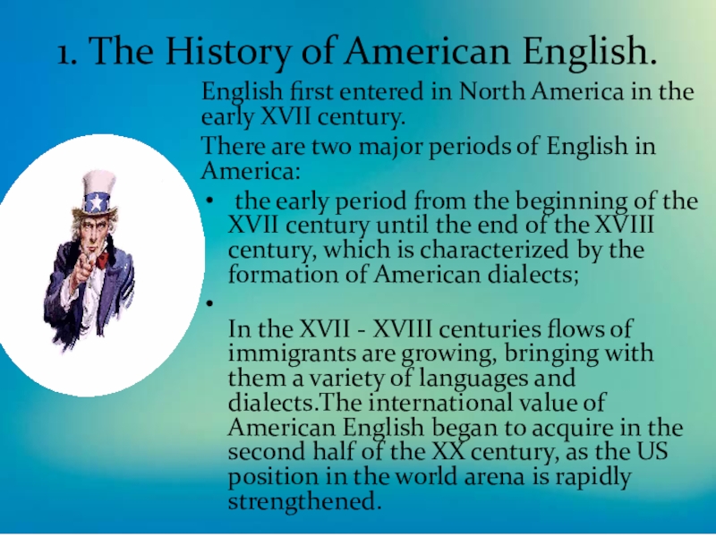 In the XVII - XVIII centuries flows of immigrants are growing, bringing with them a variety of languages and dialects.The international value of American English began to acquire in the second half of the XX century, as the US position in the world arena is rapidly strengthened.