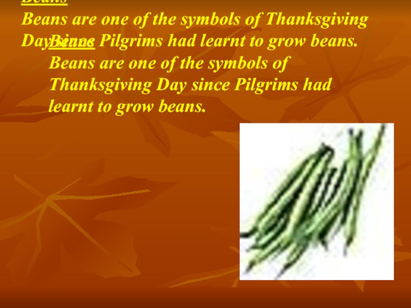 Beans are one of the symbols of Thanksgiving Day since Pilgrims had learnt to grow beans.