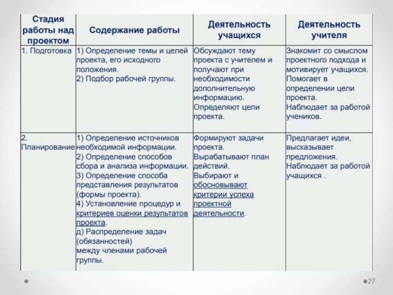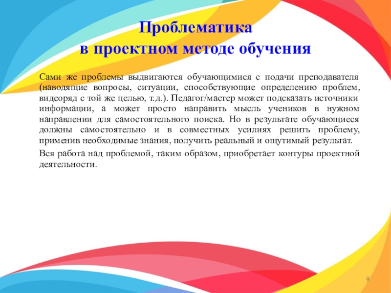 преподавателя (наводящие вопросы, ситуации, способствующие определению проблем, видеоряд с той же целью, т.д.). Педагог/мастер может подсказать источники информации, а может просто направить мысль учеников в нужном направлении для самостоятельного поиска. Но в результате обучающиеся должны самостоятельно и в совместных усилиях решить проблему, применив необходимые знания, получить реальный и ощутимый результат.