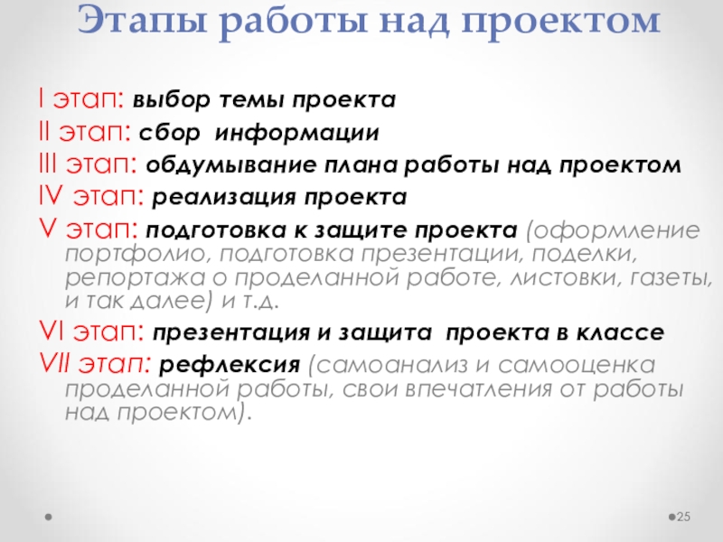 V этап: подготовка к защите проекта (оформление портфолио, подготовка презентации, поделки, репортажа о проделанной работе, листовки, газеты, и так далее) и т.д.