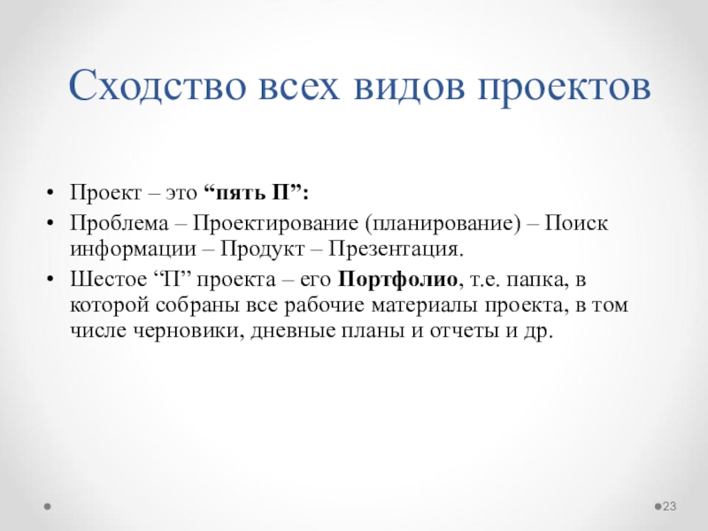Шестое “П” проекта – его Портфолио, т.е. папка, в которой собраны все рабочие материалы проекта, в том числе черновики, дневные планы и отчеты и др.