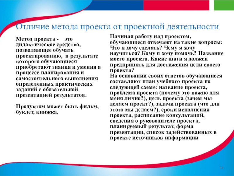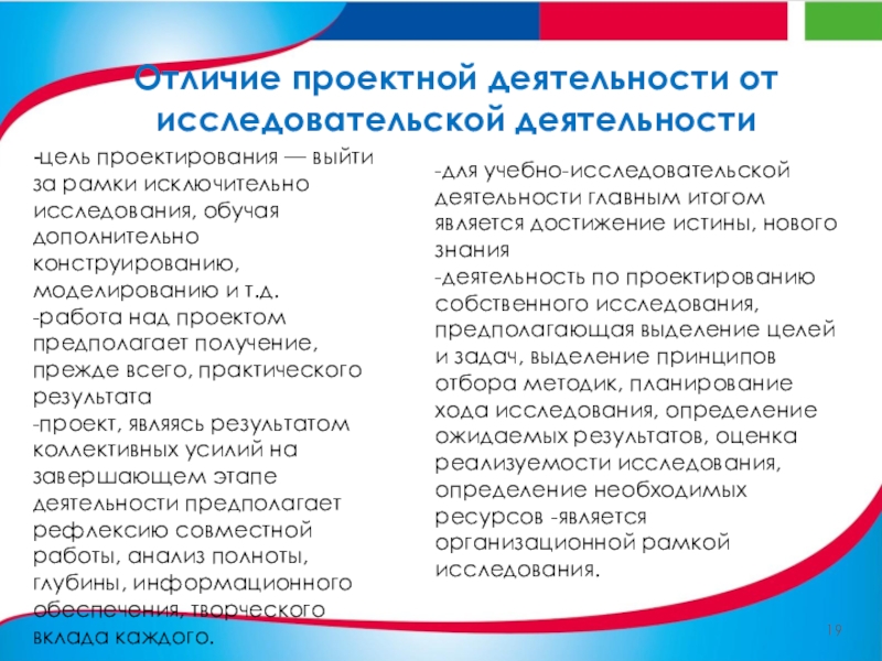 Слайд 19Отличие проектной деятельности от исследовательской деятельности