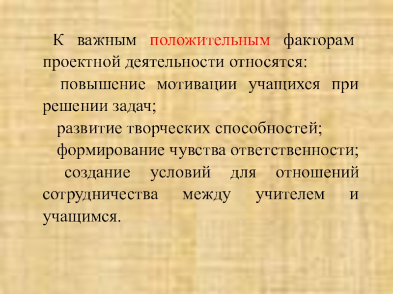 Слайд 13К важным положительным факторам проектной деятельности относятся: