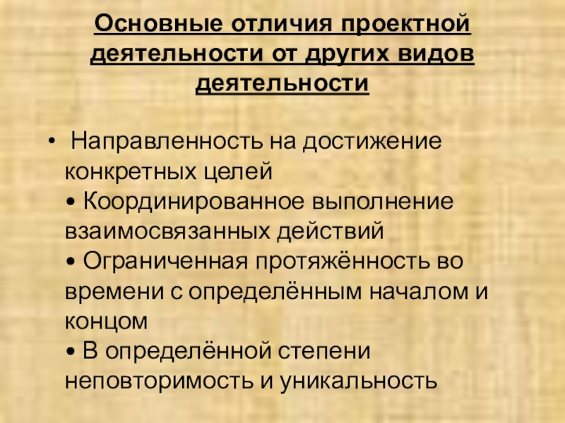 Слайд 10Основные отличия проектной деятельности от других видов деятельности
