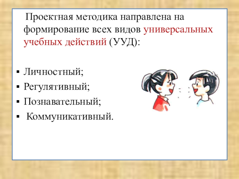 Проектная методика направлена на формирование всех видов универсальных учебных
