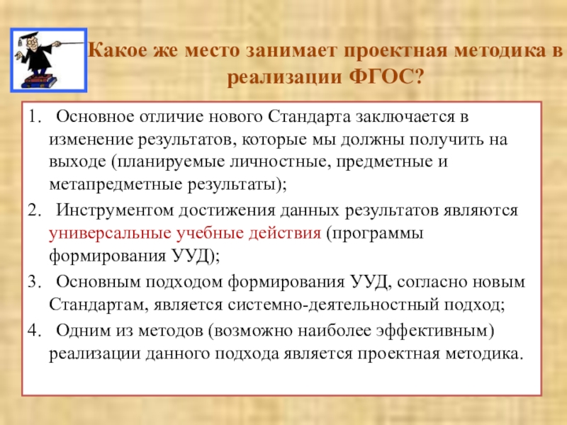 Слайд 5Какое же место занимает проектная методика в реализации ФГОС?