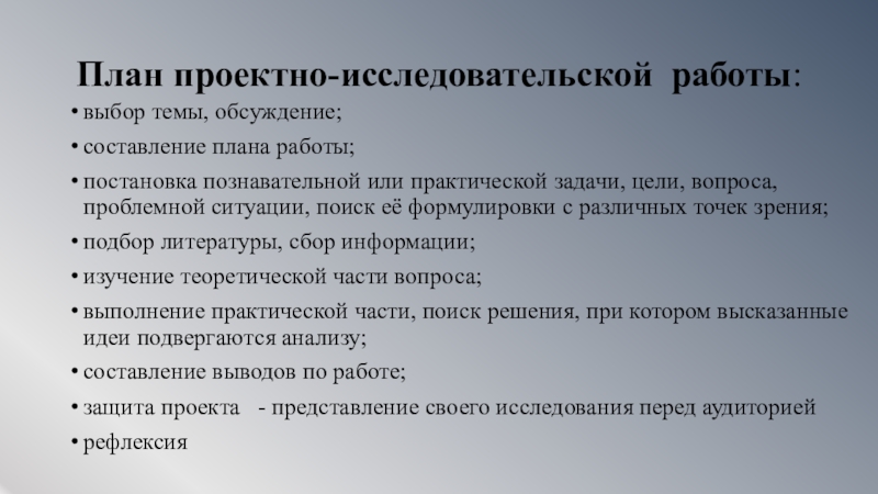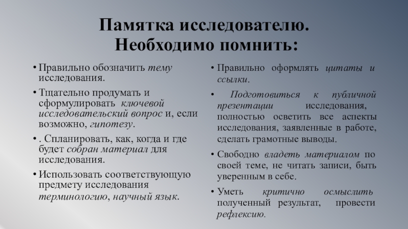 Подготовиться к публичной презентации исследования, полностью осветить все аспекты исследования, заявленные в работе, сделать грамотные выводы.