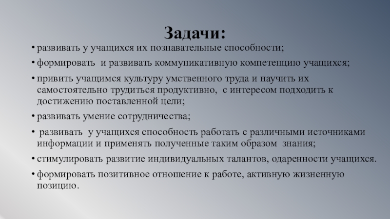 учащимся культуру умственного труда и научить их самостоятельно трудиться продуктивно, с интересом подходить к достижению поставленной цели;