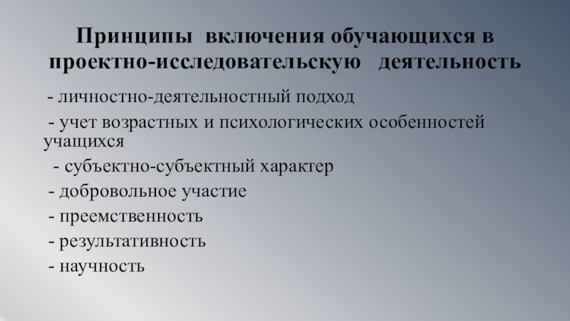 Слайд 8Принципы включения обучающихся в проектно-исследовательскую деятельность