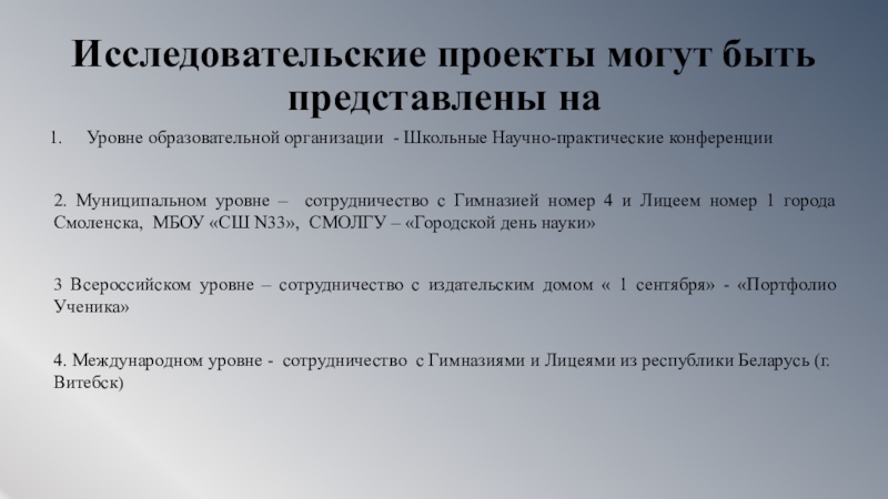 2. Муниципальном уровне – сотрудничество с Гимназией номер 4 и Лицеем номер 1 города Смоленска, МБОУ «СШ N33», СМОЛГУ – «Городской день науки»