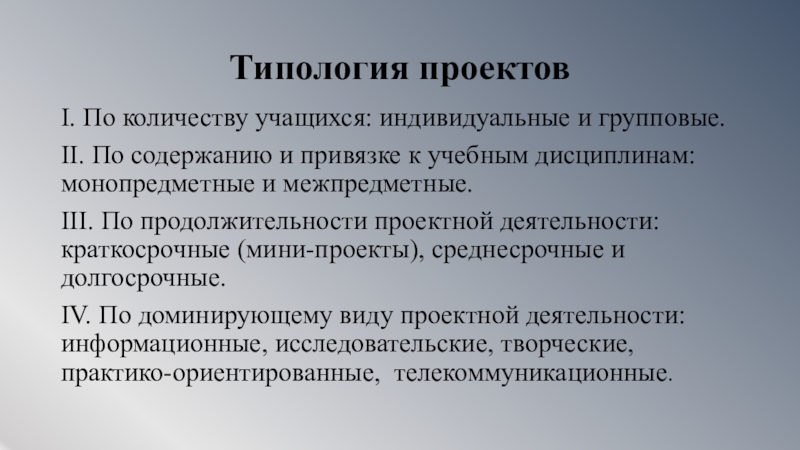IV. По доминирующему виду проектной деятельности: информационные, исследовательские, творческие, практико-ориентированные, телекоммуникационные.