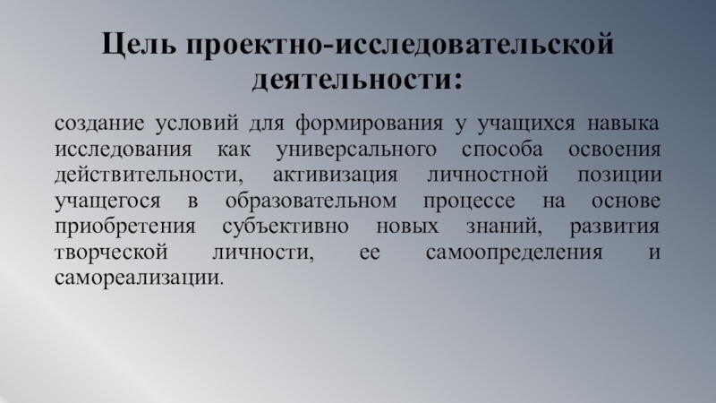 универсального способа освоения действительности, активизация личностной позиции учащегося в образовательном процессе на основе приобретения субъективно новых знаний, развития творческой личности, ее самоопределения и самореализации.