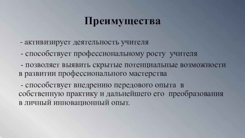 - способствует внедрению передового опыта в собственную практику и дальнейшего его преобразования в личный инновационный опыт.