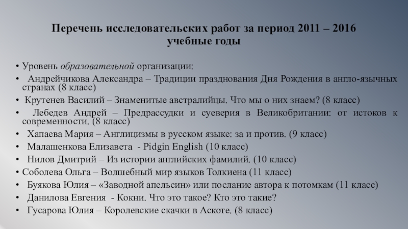 Слайд 28Перечень исследовательских работ за период 2011 – 2016 учебные годы