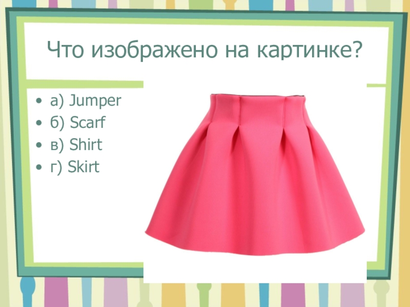 Что изображено на картинке?а) Jumperб) Scarfв) Shirtг) Skirt