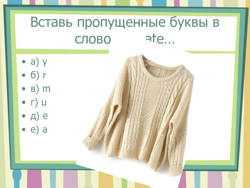 Вставь пропущенные буквы в слово Sw…ate…а) yб) rв) mг) uд) eе) a