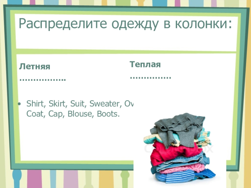 Слайд 7Распределите одежду в колонки: