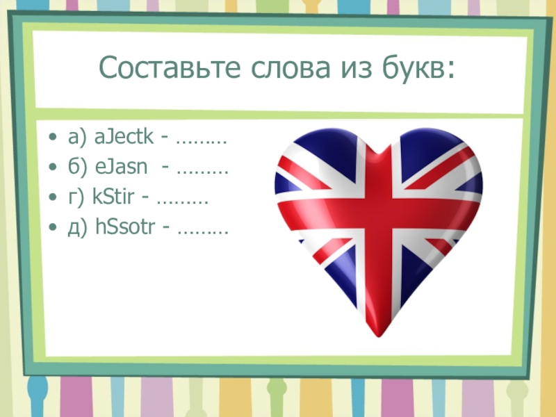 Составьте слова из букв:а) aJectk - ………б) eJasn - ………г) kStir - ………д) hSsotr - ………