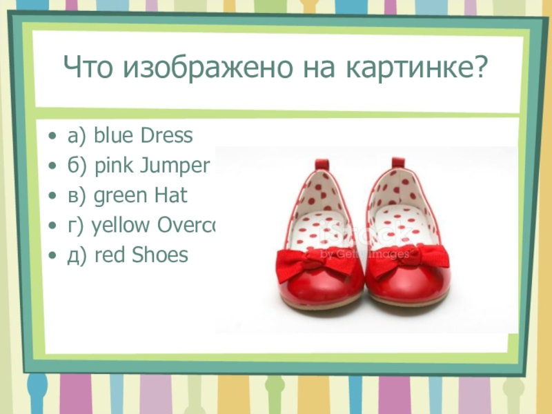 Что изображено на картинке?а) blue Dressб) pink Jumperв) green Hat г) yellow Overcoatд) red Shoes